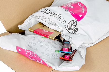 Die Kombination aus Kühltasche paperfloc Pouch, die aus recyceltem Altpapier besteht und Kühlakku easyAKKU Fresh, hält Ihre bestellten Nougat- und Schokoladen-Leckereien zuverlässig kühl für bis zu 48 Stunden.