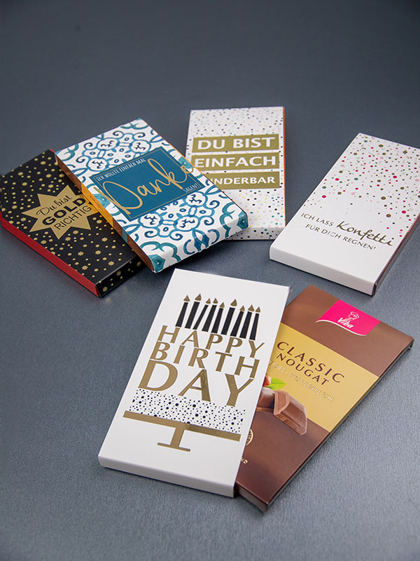 Im Handumdrehen zaubern Sie aus einer normalen Tafelschokolade ein individuelles Schokoladengeschenk: Einfach die Enden des Auflegers an den Knickkanten falten, auf die geschlossene Verpackung der Schokolade legen und die Laschen in die obere und untere Öffnung der Schokoladenfaltschachtel einstecken. Et voilà – fertig ist das persönliche Geschenk.