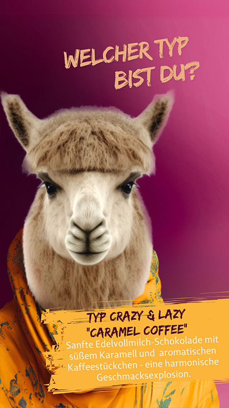 Die Sorte "CARAMEL COFFEE" birgt ihre Besonderheiten bereits im Namen und ist perfekt für alle Genießer die Karamell und Kaffee lieben. Die sanfte Edelvollmilch-Schokolade ist mit süßem Karamell verfeinert, geröstete Kaffeestückchen ergänzen das samtig weiche Geschmacksbild. Der Genusstyp "CRAZY & LAZY" kommt bei dieser klein aber oho 37g Schokolade vollends auf seine Kosten. Besonders Liebhaber von feinstem Karamell werden sich freuen, denn diese sanfte Süße der karamelligen Edelvollmilch-Schokolade und ihrem Energiekick durch aromatisierte Kaffeestückchen versprechen sinnlichen Genuss, der mit einer Tasse Espresso zudem perfekt harmoniert. Unwiderstehlich lecker!