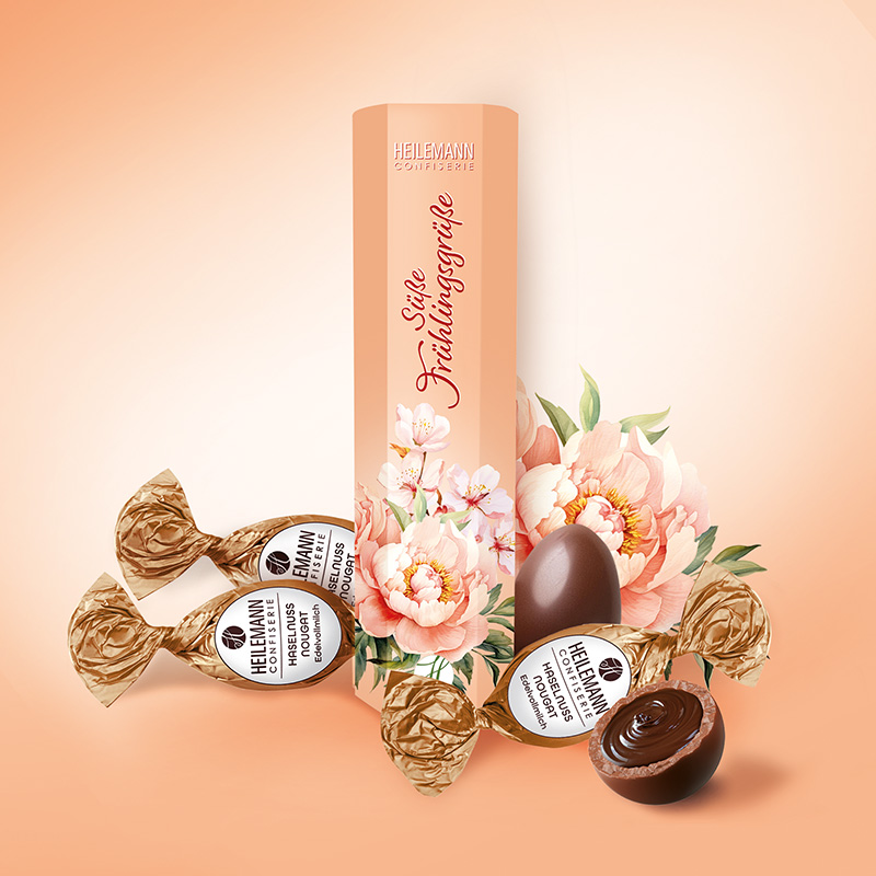 Süße Frühlingsgrüße – nicht nur zur Osterzeit Tauchen Sie ein in die raffinierte Welt unserer Frühlingsgeschenke. Die hochwertig gefüllten Schokoladen-Eier vereinen zart schmelzenden Nougat in Edelvollmilch-Schokolade. Die eleganten Verpackungen, verziert mit zarten Blumenmotiven, ziehen die Blicke auf sich.