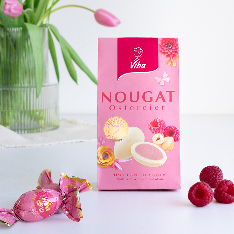 Köstliche Ostereier aus leckerer weißer Schokolade und gefüllt mit dem neuen fruchtigen Himbeer Nougat, einzeln verpackt in rosa Folie. Als Ostergeschenk für Familie, Verwandtschaft oder die besten Freunde ist es eine köstliche Naschfreude für das Osternest. Mit etwas Kreativität lässt sich aus dem Nougat-Eier-Beutel eine nette Osterdeko zaubern.