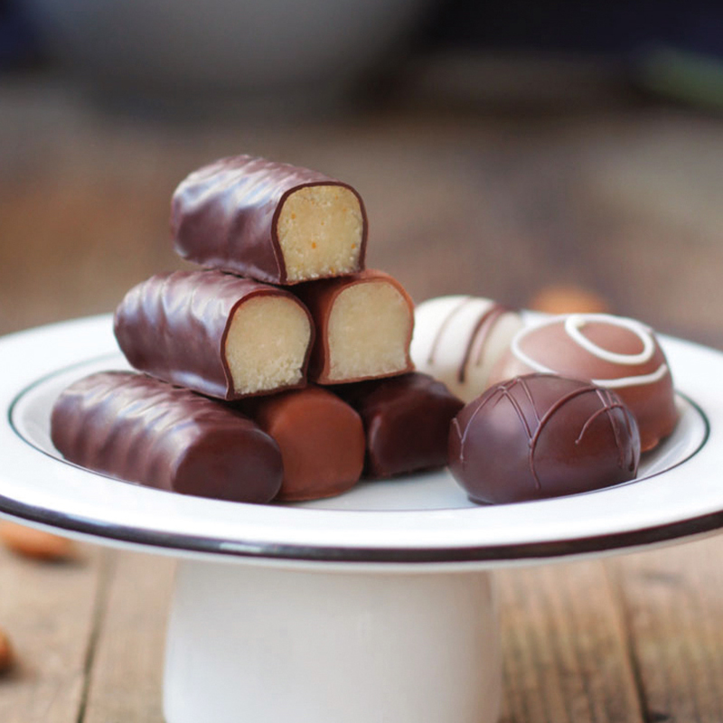 Softer Edelmarzipan von höchster Qualität (90/10er), eingebettet in einem feinherben Schokoladenmantel aus Zartbitterschokolade verspricht ein besonders zartes und vollmundiges Geschmackserlebnis.