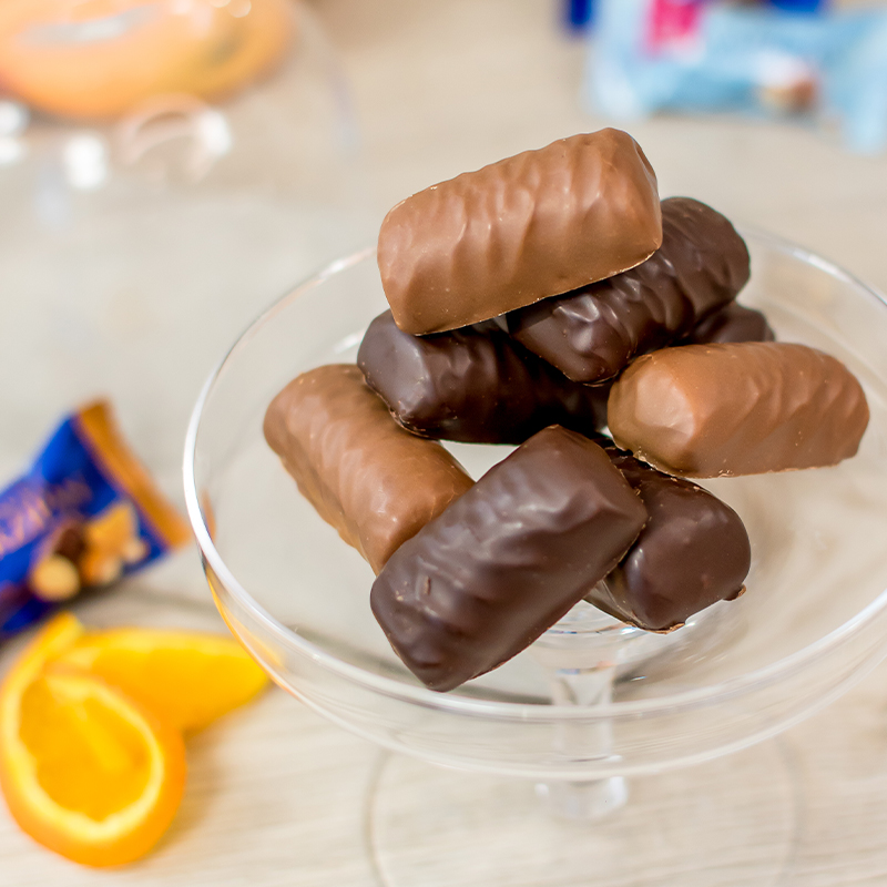 Softes Edelmarzipan trifft auf fruchtigen Orangengeschmack in einem feinherben Schokoladenmantel aus Zartbitterschokolade.