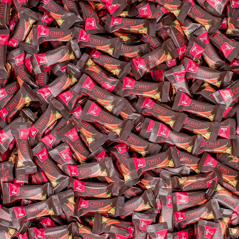 Der klassische Viba Nougat, mit seinem zarten Schmelz, bekommt durch die feurige Chili im Abgang eine angenehm scharfe Note. Die Kombination von fein, weich und samtig mit der milden Schärfe machen die Nougat Pralinen von Viba zu einem hocharomatischen Geschmackserlebnis! 100 g Chili Nougat Genuss sind genau das Richtige für alle Nougatfans, die es nicht nur süß, sondern auch scharf mögen.