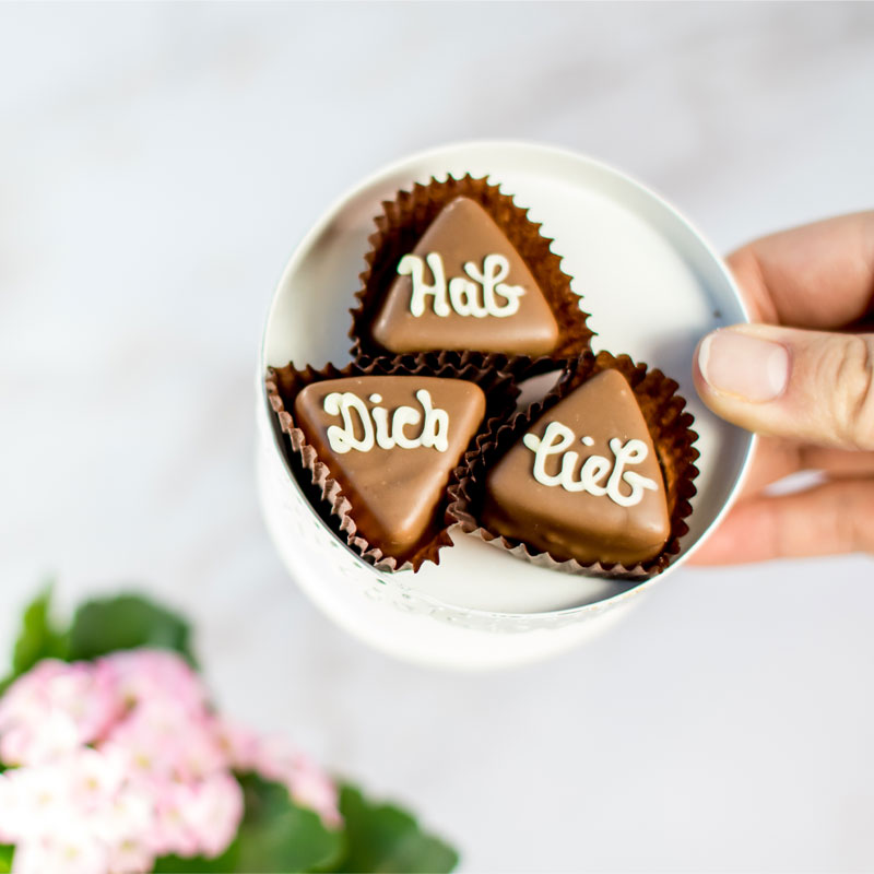 Mandel-Sahne-Nougat trifft auf edle Vollmilchschokolade. Die Nougat Pralinen Hab Dich Lieb könnten nicht leckerer sein: zart schmelzendes Mandel Sahne Nougat umhüllt von edler Vollmilchschokolade und verziert mit einem Hauch weißer Schokolade sorgen für eine Aufmerksamkeit der besonderen Art. Senden Sie süße Botschaften an Ihre Lieben an Muttertag, Vatertag oder anderen Herzensanlässen mit oder gönnen Sie sich selbst eine kurze Auszeit mit unseren Nougat Pralinen.