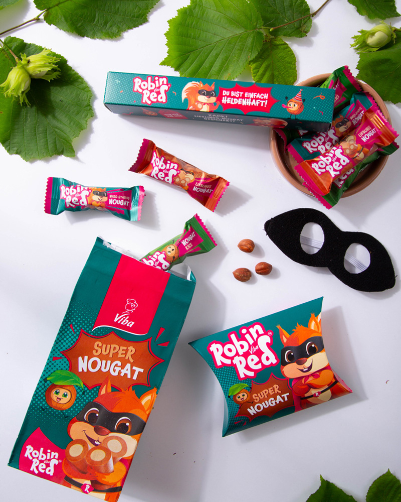 Entdecke die neue Superhelden-Edition von Viba: Im farbenfrohen Robin Red Schicht-Nougat Beutel steckt nicht nur unser superstarkes Eichhörnchen Robin Red, sondern auch jede Menge zartschmelzender Genuss. Gemeinsam mit seinem kleinen Freund Hazel, der Haselnuss, sorgt Robin für süße Glücksmomente bei Groß und Klein.