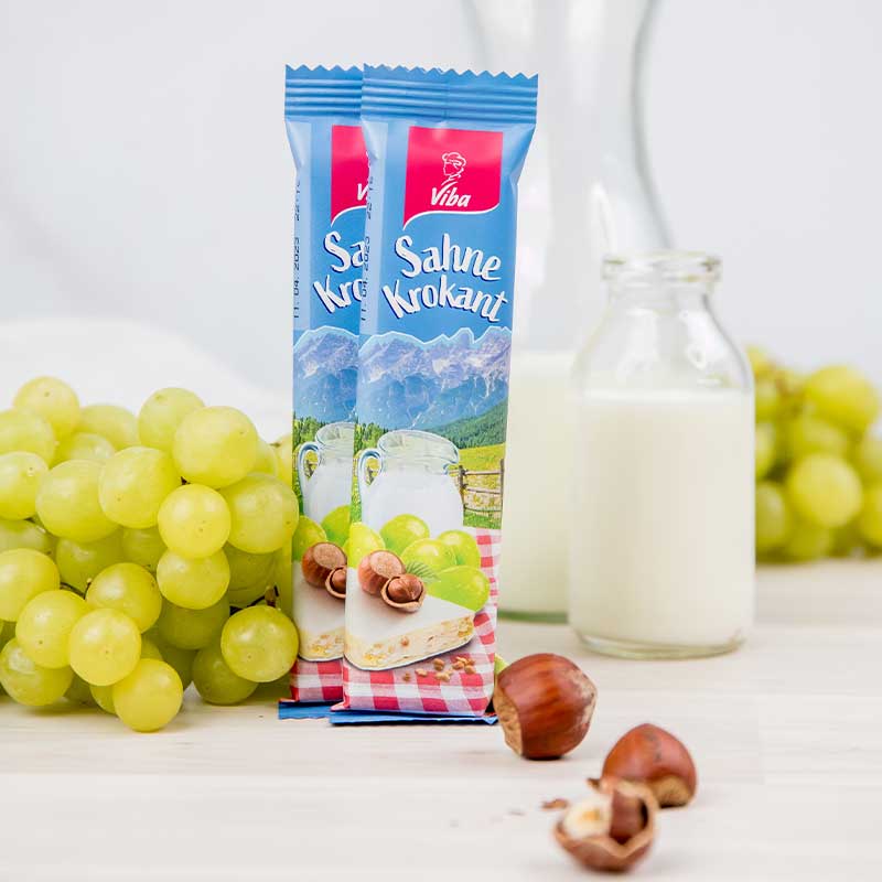Dieser köstliche Milchriegel ist veredelt mit knusprigem Haselnusskrokant und Sultaninen – Mmmhhh lecker! Eben „allererste Sahne“. Cremig und zugleich crunchig durch die kleinen Krokant-Stückchen. Eben ein schmackhafter Pausengenuss.