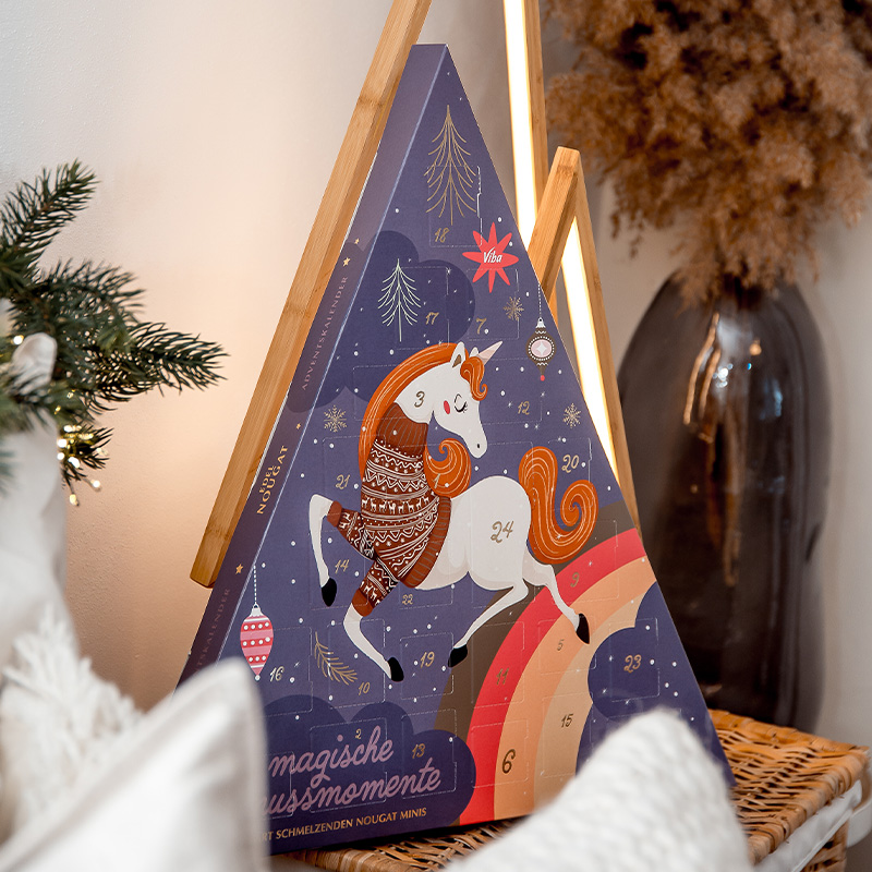 Auf dem neuen Viba Adventskalender sind sagenhafte Einhörner mit glückbringenden Regenbogen zu sehen! Die lustigen Einhörner zieren den liebevoll gestalteten Adventskalender in lila mit goldverdelten Akzenten. Hinter 24 Türchen haben Sie feinste Nougat-Variationen versteckt und versüßen uns damit das Warten auf Weihnachten Tag für Tag.