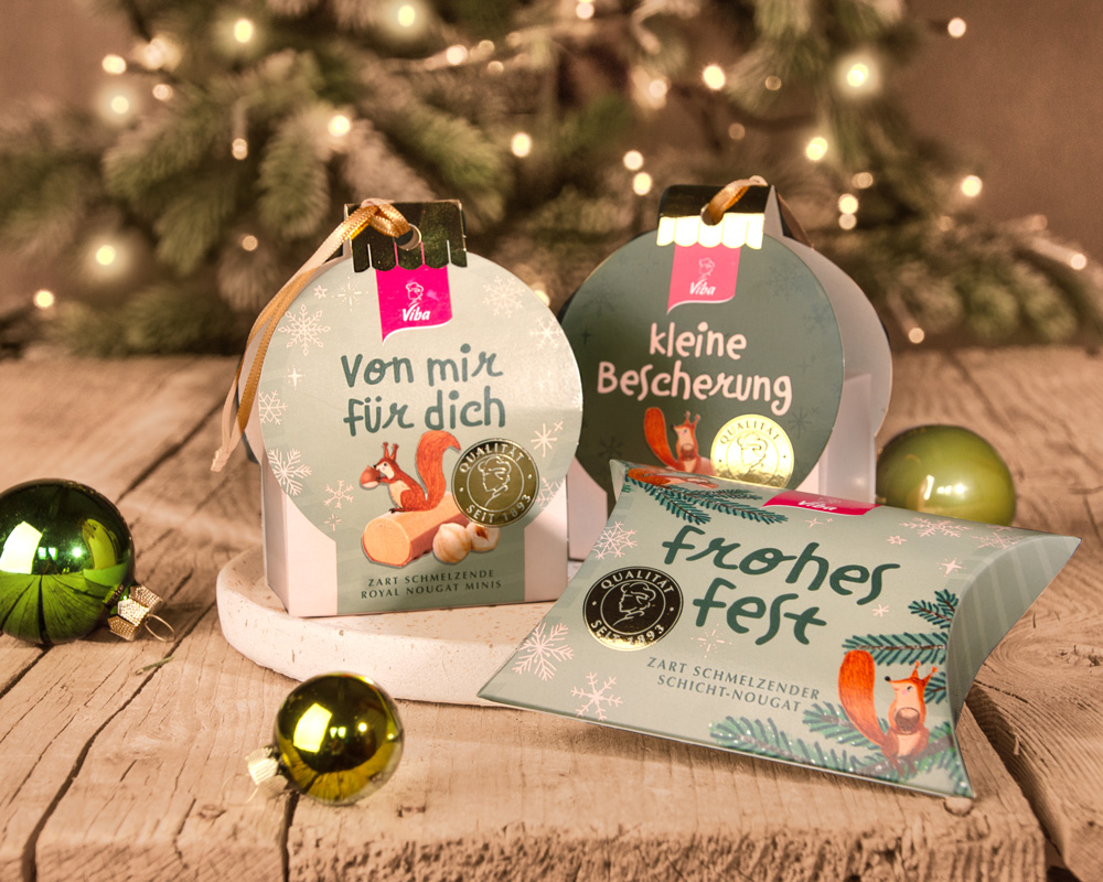 Süße Weihnachtsgrüße lassen sich am besten mit Viba Nougat übermitteln, zum Beispiel mit dem Kleinen Gruß "CASSIC". Eine kleine, feine Geschenkpackung mit Weihnachtsbaumkugel-Kontur.