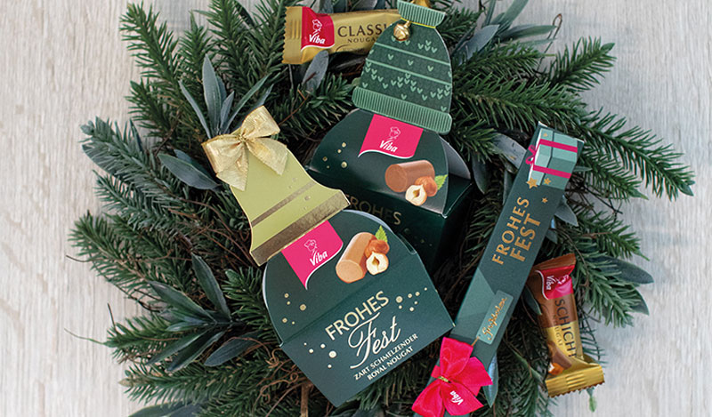 Für die süße Freude in der Winterzeit zeigt sich der kleine Weihnachtsgruß mit dem Motiv „Glocke“ von seiner goldenen Nougatseite. Gefüllt mit vier Nougat Minis à 10 g des beliebten, zart schmelzenden und hellen Viba Royal Nougat ist der Gruß eine sympathische Aufmerksamkeit in der Weihnachtszeit. Die Glocke glitzert in Gold durch partielle Veredelung und an der Spitze ziert eine Echtschleife den süßen Weihnachtsgruß. Ein perfektes Accessoire für den leckeren Plätzchenteller mit ausgestochenen Sternen, Engelchen und Glocken. Mit der extra Portion Nougat schmeckt alles doppelt so gut.