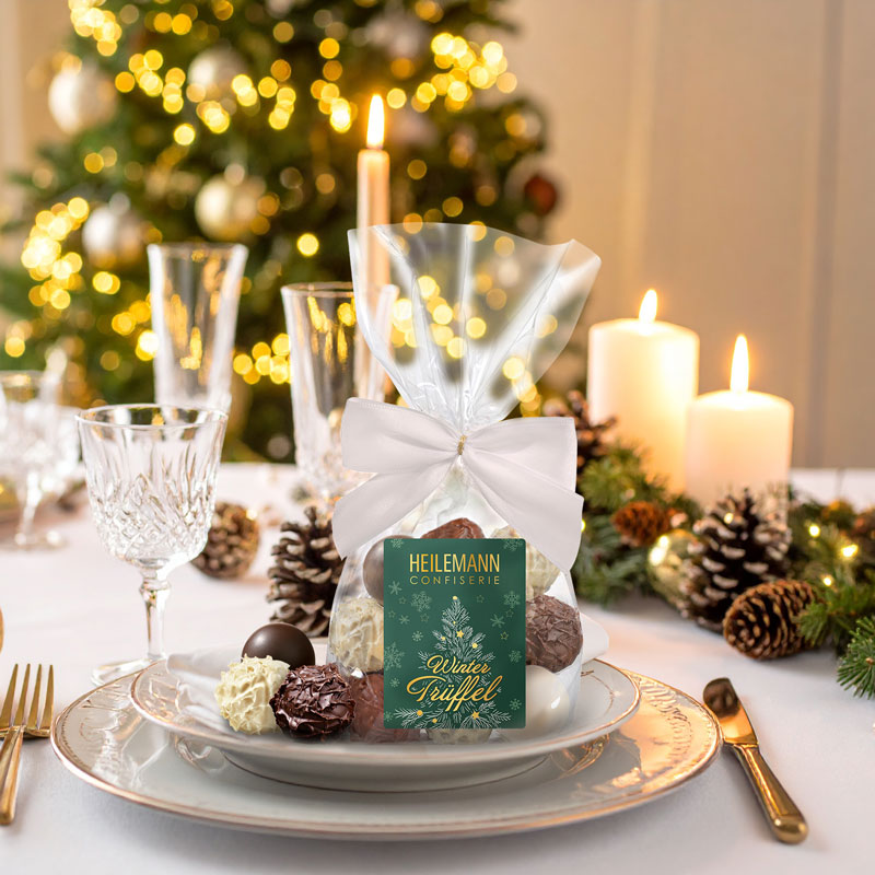 Die Heilemann Winter-Trüffel sind ein Traum für jeden Pralinen-Liebhaber. Die Trüffel mit weihnachtlichem Geschmack im klarsichtigen Beutel mit Schleife sind sowohl als Geschenk, als auch zum selbst vernaschen ideal geeignet. Die feine Trüffel-Auswahl enthält eine Mischung aus Edelvollmilch-, Edelbitter- und weißen Schokoladen-Pralinen.